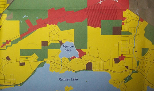 Minnow Lake CAN and MLRG News: Report from CAN "What's Happening" Meeting - Sept. 22nd 2009 Presentation and Minutes of Meeting Held at Minnow Lake Place "Official Plan" Map of Minnow Lake Area showing by colour various "development" areas - yellow is residential zoned - green is park area - red areas are commercial and/or institutional.
