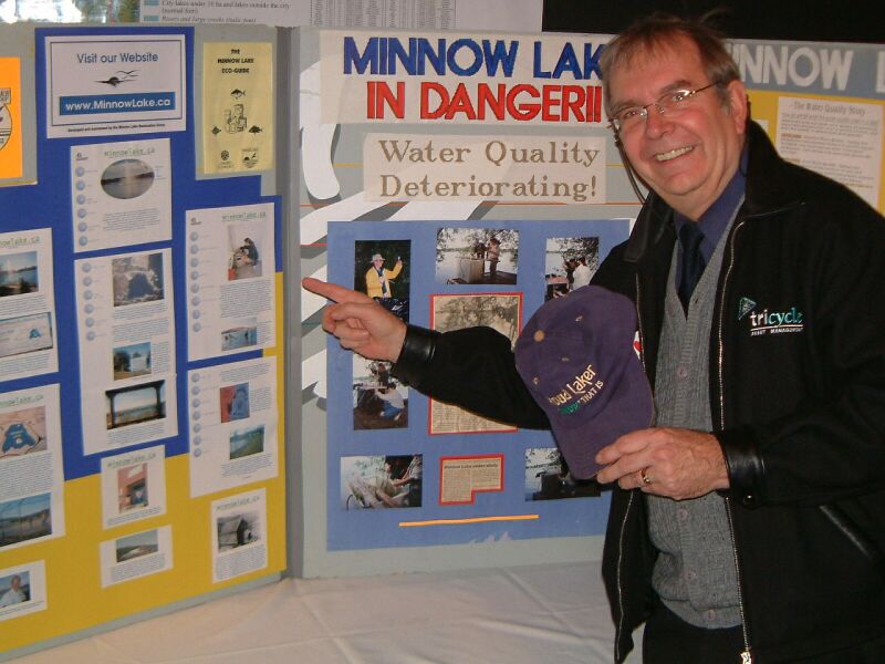 The Minnow Lake Restoration Group is responsible for coordinating efforts to have the Minnow Lake Millennium Fountain installed in July 2000. A prominent local businessperson and resident of the area, Mr. Norman C. Bradley, contributed $20,000 towards the cost of the fountain. The Restoration group was able to obtain matching and supporting funding from the municipal, provincial and federal governments to cover the $60,000 cost for the fountain which operates from May to October. A plaque on the fountain control building on the shores of the lake across from the Carmichael sports complex recognizes those who contributed. Without Mr. Bradley's general donation it would not have been possible to raise the other money required. It is an excellent example of what one person can do to benefit their community. Our thanks to Norm Bradley for this. Mr. Bradley passed away in 2021.   . President of the Minnow Lake Restoration Group, John Lindsay, shown with display. John served on the first board of the Greater Sudbury Lake Improvement Advisory Committee and also is a current member of the GSWA (Greater Sudbury Lake Water Advisory Committee (Source Protection) and the Ramsey Lake Stewardship committee. Work continues to protect our natural resources.