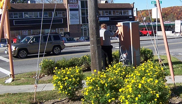 CAN Worker painting over graffiti on utility box at intersection of Bancroft and Bellevue. Webmaster |